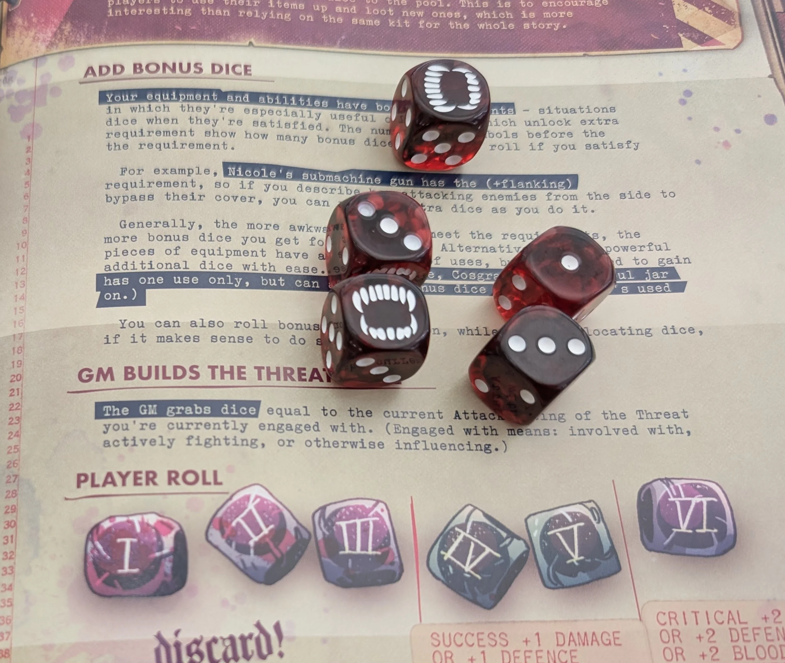Another thing I realized is that next time I play this I’m bringing some little glass beads. Eat the Reich lets vampires share blood (their power and and healing pool) and this group really liked doing that, and having little tokens to hand around would have been more fun and tactile than tracking it on their character sheet. I have some on-theme dice from Baron of Dice that I think also really help set the mood, having the bite symbol on the 6 reminds players it’s a crit. I use standard D6s as the GM because the GM doesn’t crit.