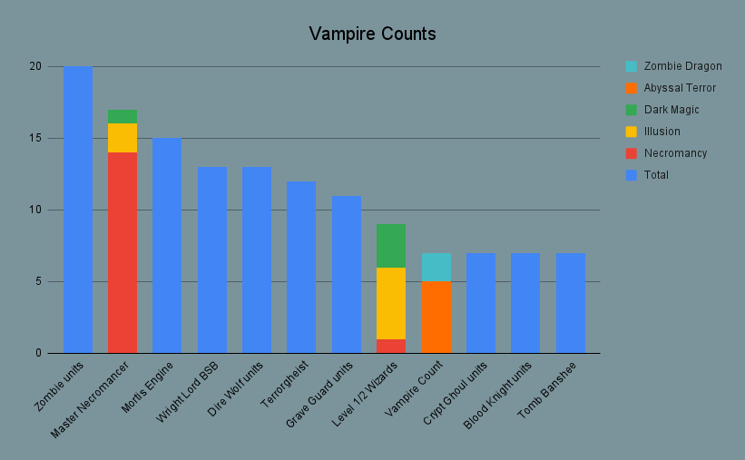 More broadly in characters we see all but one list takes a BSB, and we have 26 wizards across the 14 lists. Vampire Counts got better representation than I expected, most taking 2 wizard levels.